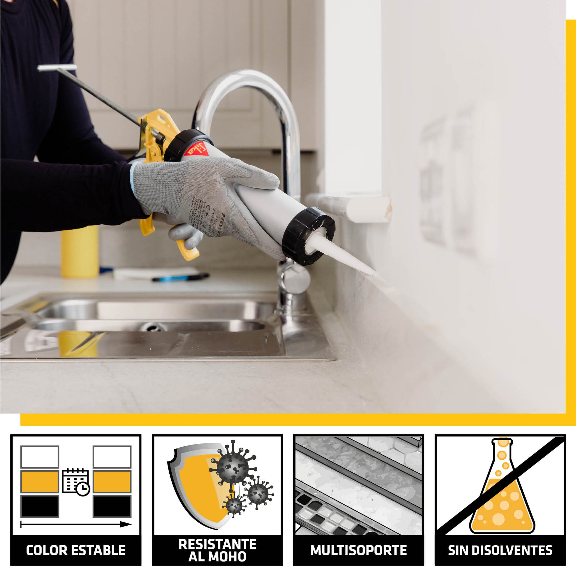 Gracias a su tecnología de curado neutro, presenta muy buena adherencia sobre múltiples materiales sin necesidad de imprimación, siendo ideal para baños, cocinas y zonas expuestas al agua.