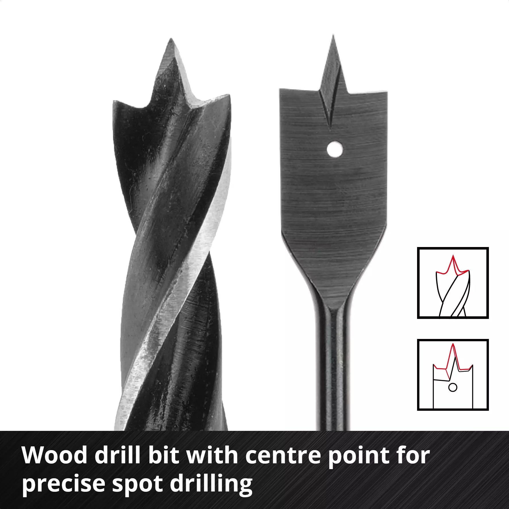 • 5 flat drill bits in sizes: 12mm, 14mm, 16mm, 18mm, 22mm.